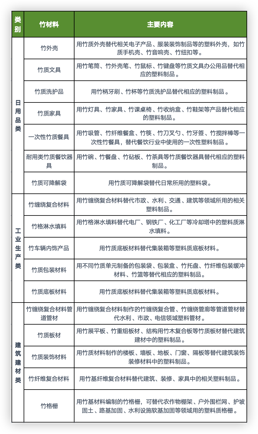 注:本名录中确定的“以竹代塑”主要产品,将根据“以竹代塑”发展情况进行动态调整,各地区、各部门可根据实际情况参照制定本地和本行业名录。