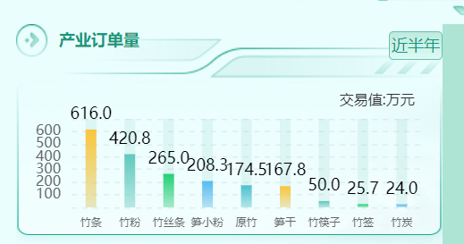 竹条:以 616 万元的交易订单量位居首位,作为竹加工产业的基础原料(可用于竹板材、竹家具等下游产品生产),其高交易量印证了区域竹制品加工产业的旺盛需求;